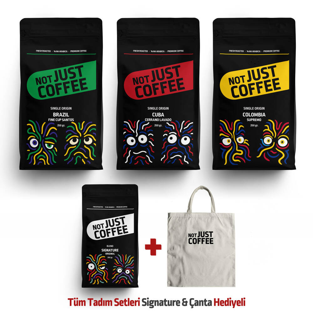 Üstelik 250g Signature Blend kahve ve not JUST COFFEE tote çanta hediye.